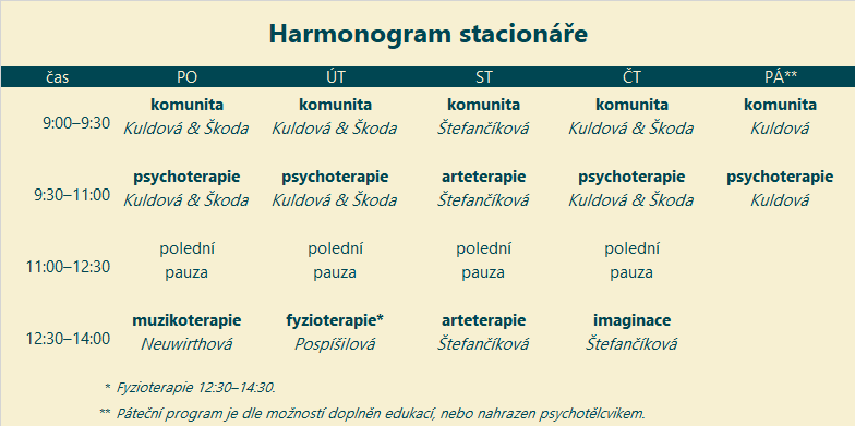 Účast ve stacionáři trvá 8 týdnů, program je od 9:00-15:00, do programu stacionáře se klienti mohou hlásit průběžně a následně absolvují program spolu v uzavřené skupině. Po dobu trvání stacionáře lze čerpat pracovní neschopnost, kterou zajišťuje naše pracoviště. Pro smysluplnou účast ve stacionáři je nutné počítat s účastí v programu stacionáře v plném rozsahu.